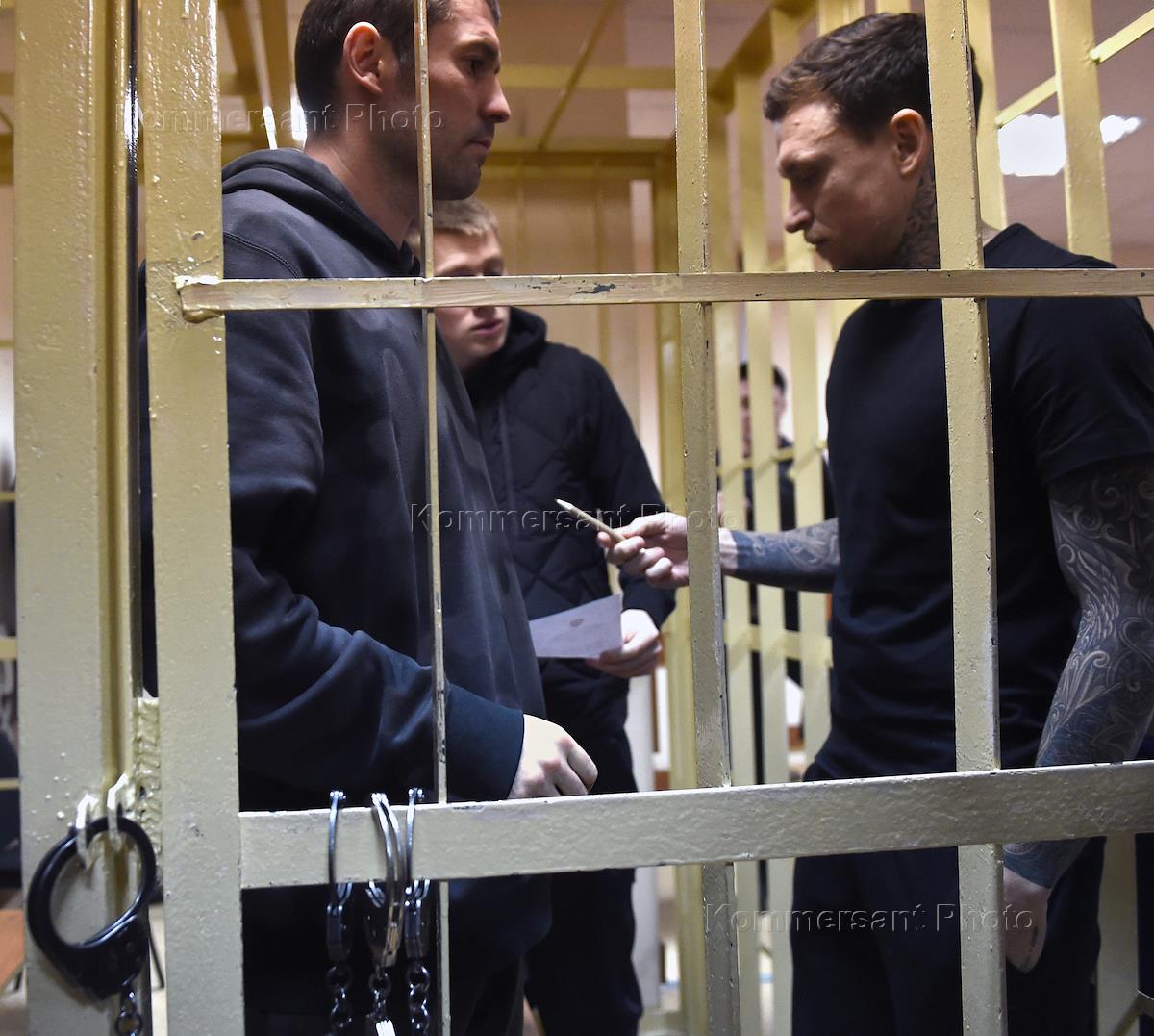 Футболисты Павел Мамаев (справа), Александр Кокорин (справа) и его брат Кирилл, обвиняемые в хулиганстве и побоях, перед началом заседания Пресненского районного суда.
