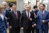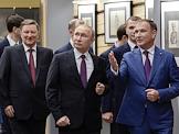 Торжественная церемония открытия всероссийской акции "Вахта памяти - 2019" в Центральном музее Великой Отечественной войны (Музее Победы) на Поклонной горе. Слева направо: ответственный секретарь Общероссийского общественного движения по увековечению памяти погибших при защите Отечества "Поисковое движение России" Елена Цунаева, мэр Москвы Сергей Собянин, специальный представитель президента России по вопросам природоохранной деятельности, экологии и транспорта Сергей Иванов, полномочный представитель президента России в Центральном федеральном округе Игорь Щеголев, президент России Владимир Путин и директор Центрального музея Великой Отечественной войны Александр Школьник (справа) во время осмотра экспозиции музея.