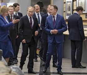 Торжественная церемония открытия всероссийской акции "Вахта памяти - 2019" в Центральном музее Великой Отечественной войны (Музее Победы) на Поклонной горе. Слева направо: ответственный секретарь Общероссийского общественного движения по увековечению памяти погибших при защите Отечества "Поисковое движение России" Елена Цунаева, специальный представитель президента России по вопросам природоохранной деятельности, экологии и транспорта Сергей Иванов, полномочный представитель президента России в Центральном федеральном округе Игорь Щеголев, президент России Владимир Путин, директор Центрального музея Великой Отечественной войны Александр Школьник (второй справа) и министр культуры России Владимир Мединский (справа) во время осмотра экспозиции музея.