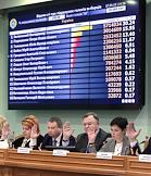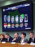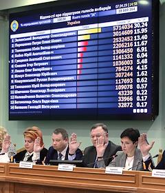 Заседание Центральной избирательной комиссии (ЦИК) Украины, где объявили официальные итоги первого тура голосования на выборах президента страны, который прошел 31 марта. Председатель ЦИК Украины Татьяна Слипачук (вторая справа) во время заседания.