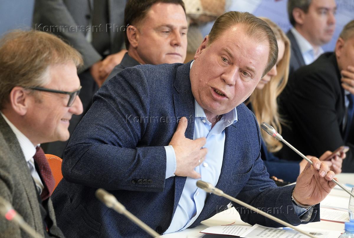 Заседание Центра общественных процедур "Бизнес против коррупции" прошло в Центре международной торговли. Председатель Общественного совета при Министерстве внутренних дел (МВД) России Анатолий Кучерена (в центре) во время заседания.