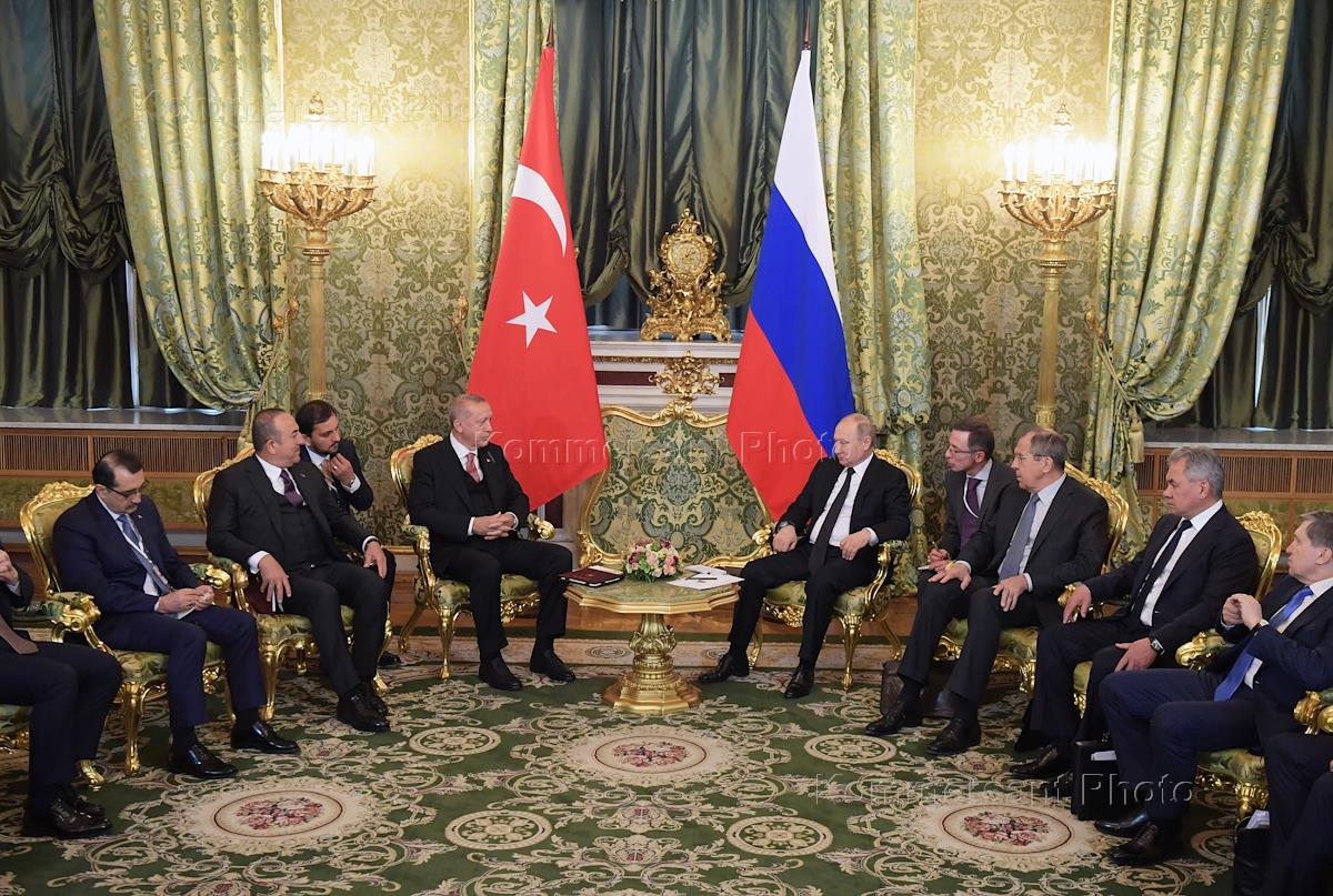 Turkish President Recep Tayyip Erdogan (center, left) during the meeting with Russian President Vladimir Putin (center, right) in the Kremlin.