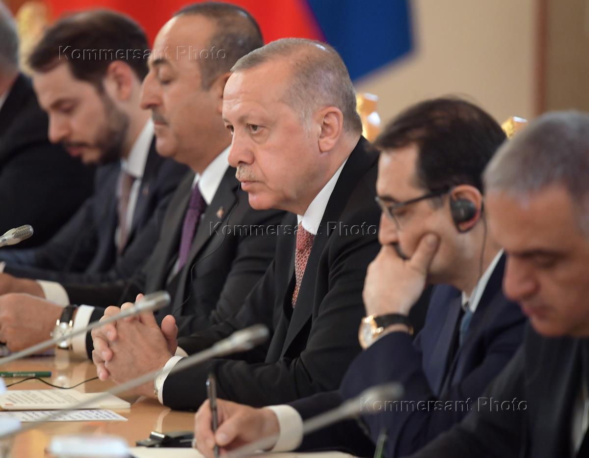Заседание Совета сотрудничества высшего уровня между Россией и Турцией прошло в Кремле. Президент Турции Реджеп Тайип Эрдоган (справа) и министр иностранных дел Турции Мевлют Чавушоглу (в центре) во время заседания.