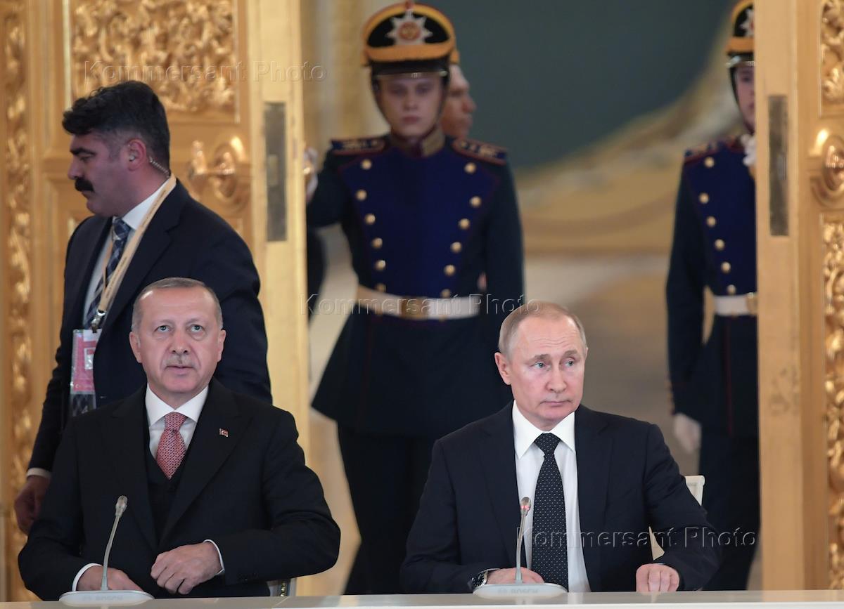 Президент Турции Реджеп Тайип Эрдоган (справа) во время встречи с президентом России Владимиром Путиным в Кремле.