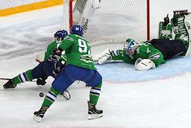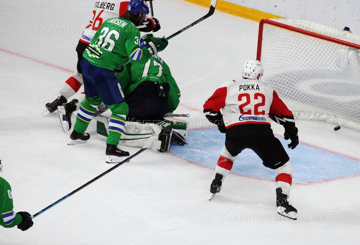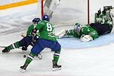 Континентальная хоккейная лига (КХЛ). Плей-офф. Финал - Восток. 6-й матч. Матч между командами "Салават Юлаев" (Уфа) - "Авангард" (Омск) прошел на стадионе "Уфа-Арена". Вратарь команды "Салават Юлаев" Юха Метсола (справа) во время матча.