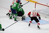 Континентальная хоккейная лига (КХЛ). Плей-офф. Финал - Восток. 6-й матч. Матч между командами "Салават Юлаев" (Уфа) - "Авангард" (Омск) прошел на стадионе "Уфа-Арена". Игрок команды "Салават Юлаев" Линус Умарк (в центре) и игрок команды "Авангард" Максим Чудинов (справа) во время матча.