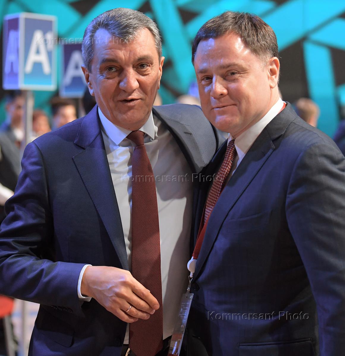 Рабочая поездка президента России Владимира Путина в Санкт-Петербург. Международный арктический форум-2019 в конгрессно-выставочном центре "Экспофорум". Полномочный представитель президента России в Сибирском федеральном округе Сергей Меняйло (слева) и председатель правления Ассоциации юристов России Владимир Груздев (справа) на форуме.