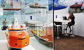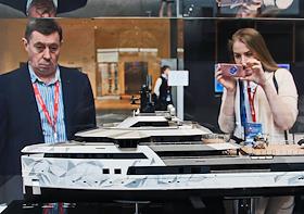 V Международный арктический форум "Арктика - территория диалога" в конгрессно-выставочном центре "Экспофорум". Посетители у макета военного корабля для Арктики.