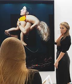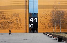 V Международный арктический форум "Арктика - территория диалога" в конгрессно-выставочном центре "Экспофорум". Экспозиция Генерального консульства Швеции. Посетители на фотовыставке "Смещения", фотографов Сары Купер и Нины Горфер - портреты женщин Лапландии.