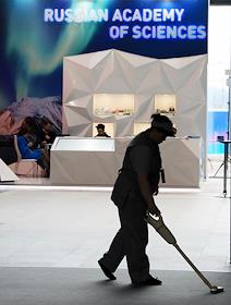 V Международный арктический форум "Арктика - территория диалога" в конгрессно-выставочном центре "Экспофорум". Подготовка к открытию форума. Уборщица с пылесосом на фоне стенда Российской академии наук (РАН).
