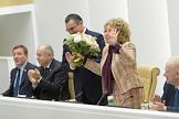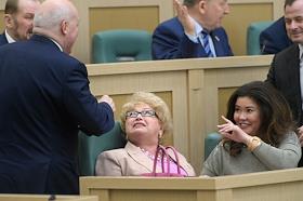 Пленарное заседание Совета Федерации (СФ) России. Слева направо: представитель в СФ России от исполнительного органа государственной власти Сахалинской области Дмитрий Мезенцев, Представитель в СФ России от исполнительного органа государственной власти Республики Тыва Людмила Нарусова и представитель от законодательного (представительного) органа государственной власти Республики Тыва Оксана Бурико перед началом заседания.