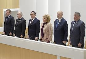 Пленарное заседание Совета Федерации (СФ) России. Слева направо: заместители председателя СФ России Андрей Турчак, Ильяс Умаханов, первый заместитель председателя СФ России Николай Федоров, председатель СФ России Валентина Матвиенко, заместители СФ России Евгений Бушмин и Юрий Воробьев во время заседания.