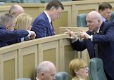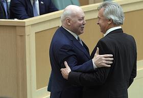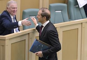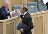 Пленарное заседание Совета Федерации (СФ) России. Представитель в СФ России от исполнительного органа государственной власти Сахалинской области Дмитрий Мезенцев (слева) и представитель в СФ России от законодательного (представительного) органа государственной власти Пермского края Алексей Пушков (справа) перед началом заседания.