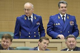 Пленарное заседание Совета Федерации (СФ) России. Советник Генерального прокурора России Сабир Кехлеров (слева) и заместители генерального прокурора России Николай Винниченко (справа) во время заседания.