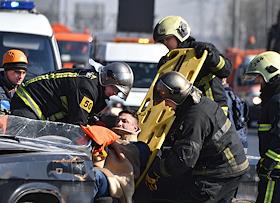 Межведомственные учения по ликвидации последствий чрезвычайной ситуации на автомобильном транспорте на 4-ом километре автомобильной дороги М-1 "Беларусь". Спасатели Московского гарнизона во время учений.