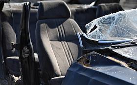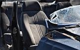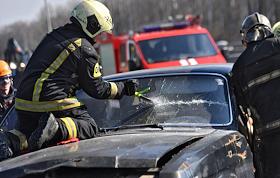 Межведомственные учения по ликвидации последствий чрезвычайной ситуации на автомобильном транспорте на 4-ом километре автомобильной дороги М-1 "Беларусь". Жанровая фотография. Автомобиль с вырезанной крышей салона и разбитое лобовое стекло.