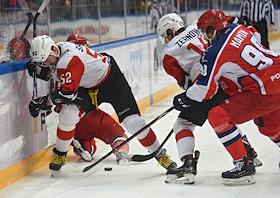 Континентальная хоккейная лига (КХЛ). Финальная серия. Матч между командами ЦСКА (Москва) - "Авнгард" (Омск) на стадионе "ЦСКА-Арена". Справа налево: игрок команды ЦСКА Максим Мамин, игроки команды "Авангард" Денис Зернов и Сергей Широков во время матча.