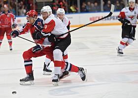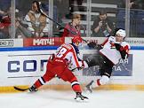 Континентальная хоккейная лига (КХЛ). Финальная серия. Матч между командами ЦСКА (Москва) - "Авнгард" (Омск) на стадионе "ЦСКА-Арена". Игрок команды "Аванград" Сергей Широков (справа) во время матча.