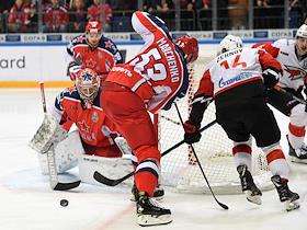 Континентальная хоккейная лига (КХЛ). Финальная серия. Матч между командами ЦСКА (Москва) - "Авнгард" (Омск) на стадионе "ЦСКА-Арена". Вратарь команды "Авангард" Игорь Бобков (справа) и игрок команды ЦСКА Андрей Светлаков (второй справа) во время матча.