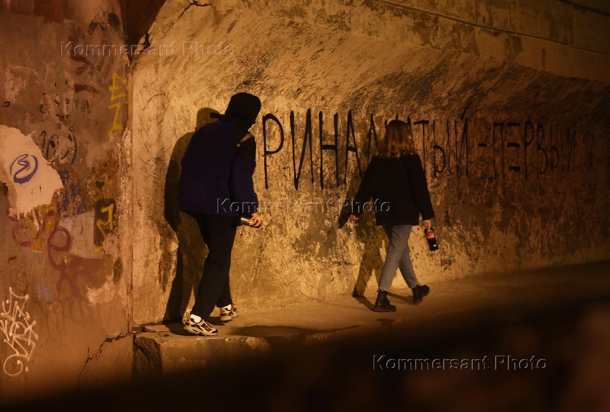 Жанровая фотография. Молодой человек с баллончиком рисует граффити.