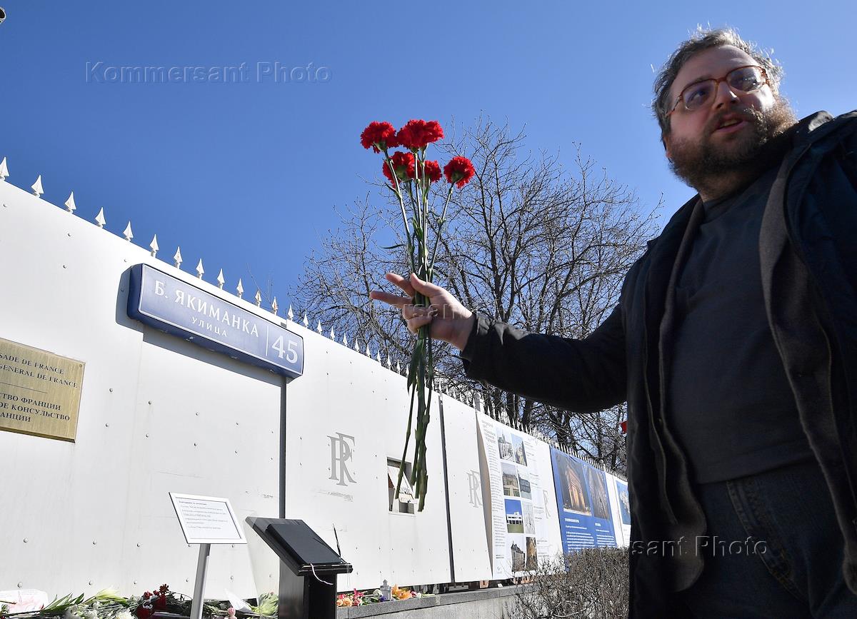 Цветы у здания Посольства Франции, в связи с пожаром в соборе Парижской Богоматери (Notre Dame de Paris) в Париже.