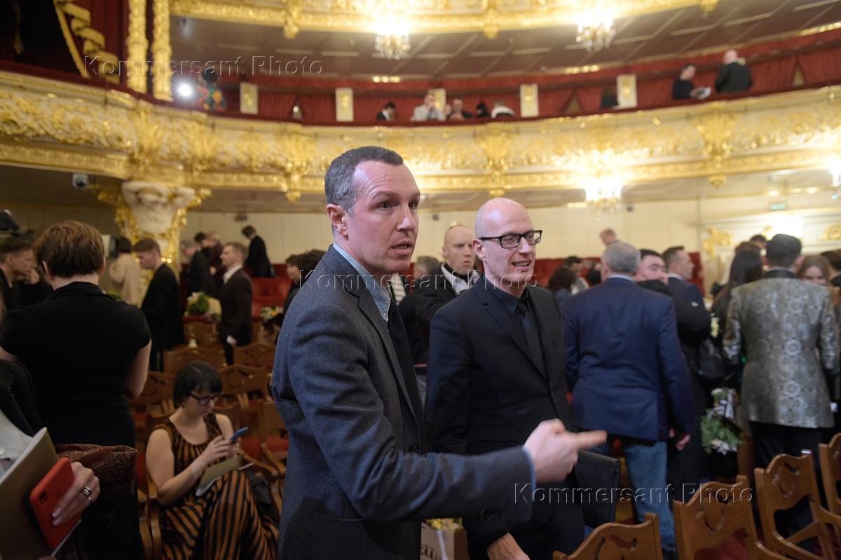XXV Церемония вручения Российской Национальной театральной премии "Золотая Маска" прошла на Исторической сцене Государственного академического Большого театра (ГАБТ). Заведующий отделом культуры ИД "Коммерсантъ" Сергей Ходнев (слева) и хореограф, художественный руководитель балета Екатеринбургского театра оперы и балета Вячеслав Самодуров (справа) во время церемонии.