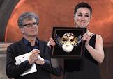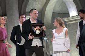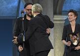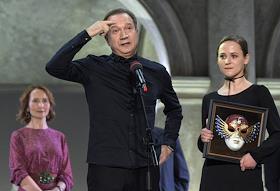 XXV Церемония вручения Российской Национальной театральной премии "Золотая Маска" на Исторической сцене Государственного академического Большого театра. Режиссер Виктор Рыжаков (в центре) и актриса Анна Блинова (справа) во время церемонии.