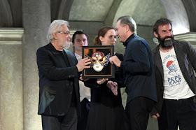 XXV Церемония вручения Российской Национальной театральной премии "Золотая Маска" на Исторической сцене Государственного академического Большого театра. Слева направо: режиссер, художественный руководитель Малого драматического театра Лев Додин, режиссер Виктор Рыжаков, актриса Анна Блинова и художник Мария Трегубова во время церемонии.