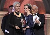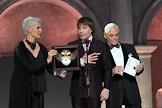 XXV Церемония вручения Российской Национальной театральной премии "Золотая Маска" прошла на Исторической сцене Государственного академического Большого театра (ГАБТ). Слева направо: сценограф, художник Сергей Бархин, актриса Ируте Венгалите и театральный художник Этель Иошпа во время церемонии.