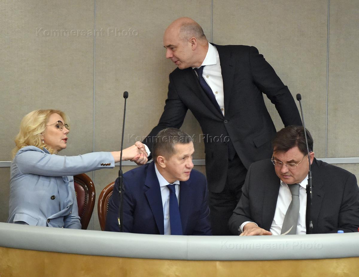 Пленарное заседание Государственной думы (ГД) России. Слева направо: заместитель председателя правительства России Татьяна Голикова, заместитель председателя правительства России - полномочный представитель президента России в Дальневосточном Федеральном округе Юрий Трутнев, первый заместитель председателя правительства России - министр финансов России Антон Силуанов и заместитель председателя правительства России - руководитель Аппарата правительства России Константин Чуйченко перед началом заседания.