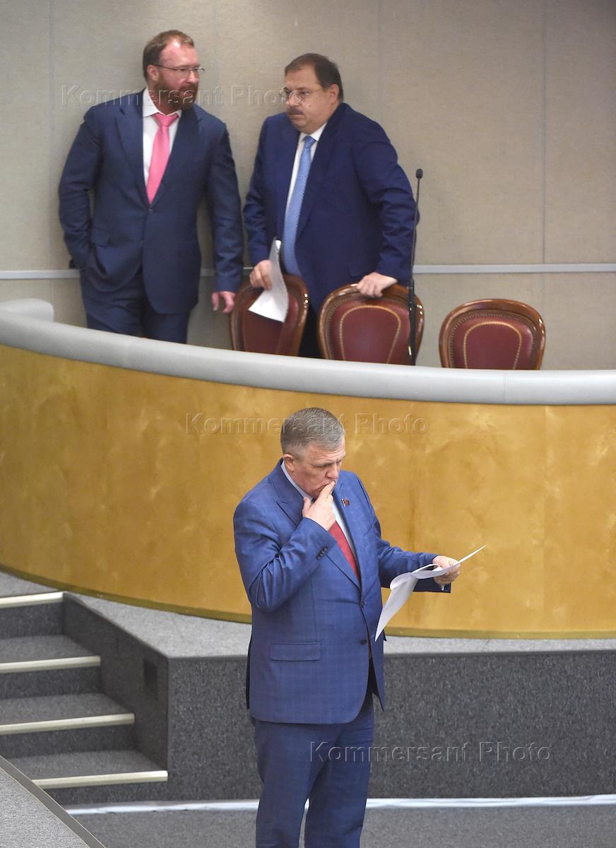 Пленарное заседание Государственной думы (ГД) России. Справа налево: председатель комитета ГД России по региональной политике и проблемам Севера и Дальнего Востока Николай Харитонов, член комитета ГД России по природным ресурсам, природопользованию и экологии Олег Лебедев и член комитета ГД России по федеративному устройству и вопросам местного самоуправления Денис Парфенов во время заседания.