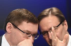 Всероссийское совещание "Об итогах прохождения субъектами электроэнергетики осенне-зимнего периода 2018-2019 годов" прошло в МИА "Россия сегодня". Председатель комитета Государственной думы России по энергетике Павел Завальный (слева) и министр энергетики России Александр Новак (справа) перед началом совещания.