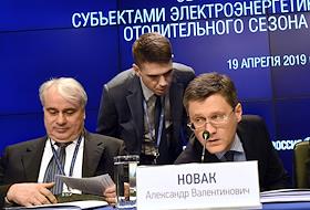 Всероссийское совещание "Об итогах прохождения субъектами электроэнергетики осенне-зимнего периода 2018-2019 годов" в МИА "Россия сегодня". Министр энергетики России Александр Новак (слева) и министр строительства и жилищно-коммунального хозяйства России Владимир Якушев (в центре) во время совещания.
