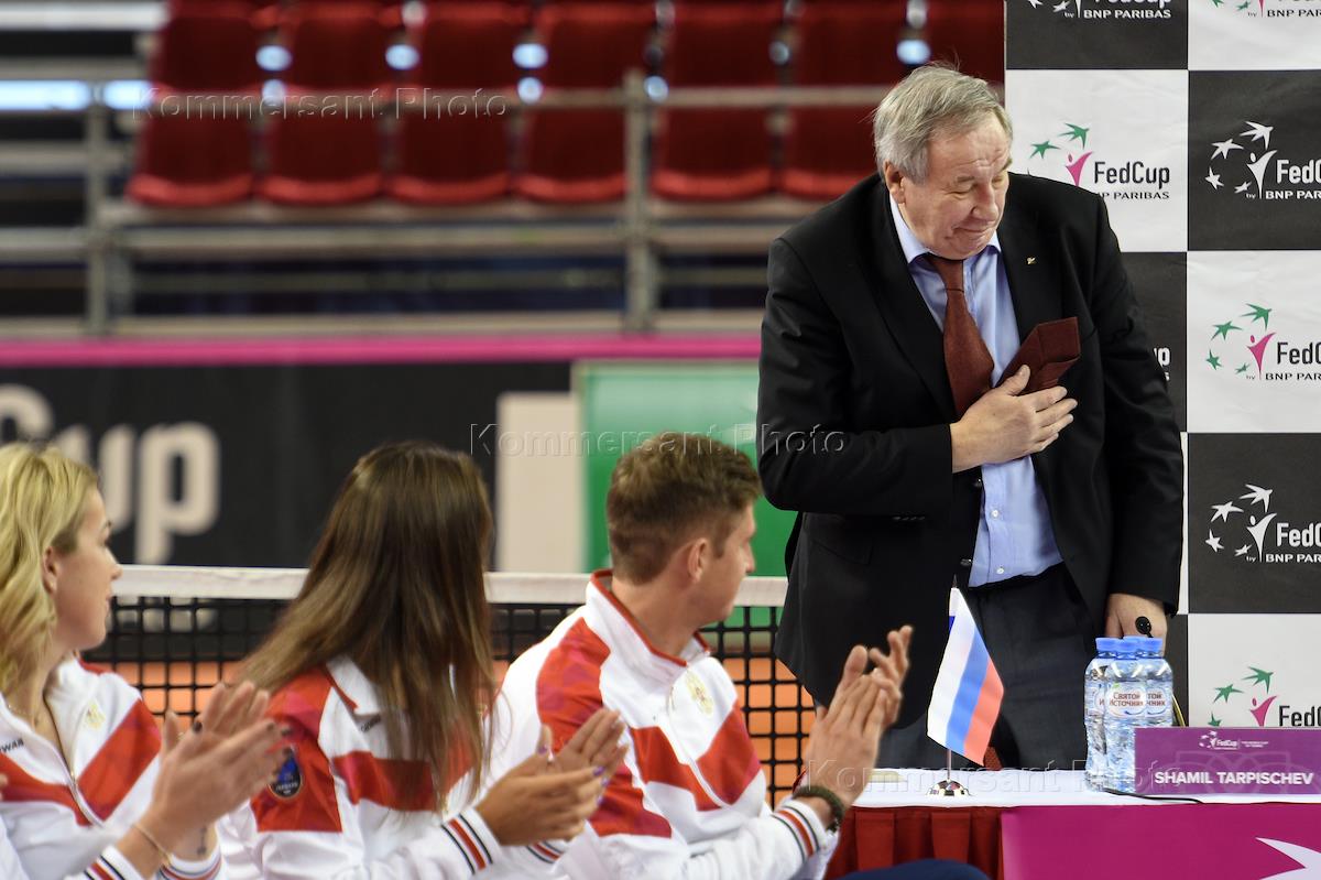 Церемония жеребьевки предстоящего матча плей-офф Мировой группы II "Кубка Федерации" между сборными командами России и Италии. Президент Федерации тенниса России Шамиль Тарпищев во время церемонии.