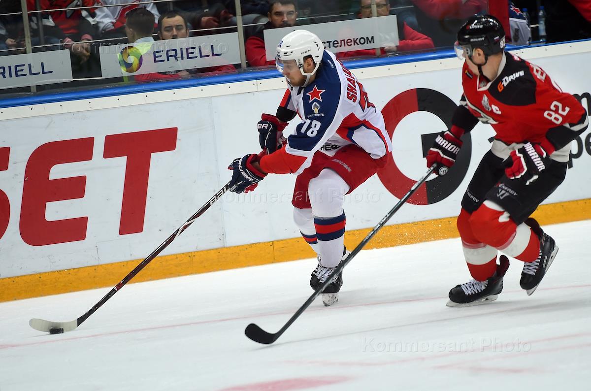 Континентальная хоккейная лига (КХЛ). Финальная серия. Матч между командами "Авнгард" (Омск) - ЦСКА (Москва) в ледовом дворце "Арена Балашиха" имени Юрия Ляпкина. Игрок команды "Авангард" Давид Деарне (слева) во время матча.
