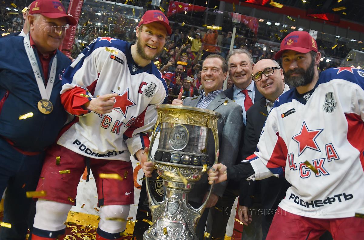 Континентальная хоккейная лига (КХЛ). Финальная серия. Матч между командами "Авнгард" (Омск) - ЦСКА (Москва) прошел в Ледовом дворце "Арена Балашиха" имени Юрия Ляпкина. Игрок команды ЦСКА Сергей Андронов (в центре) во время церемонии награждения.