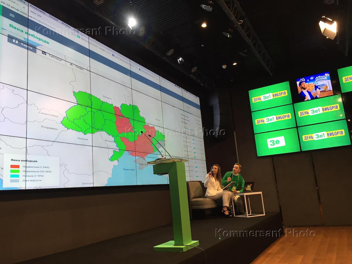 Второй тур выборов президента Украины. День голосования. Наблюдатели в избирательном штабе кандидата в президенты Украины, шоумена, генерального продюсера телеканала "Интер" Владимира Зеленского.
