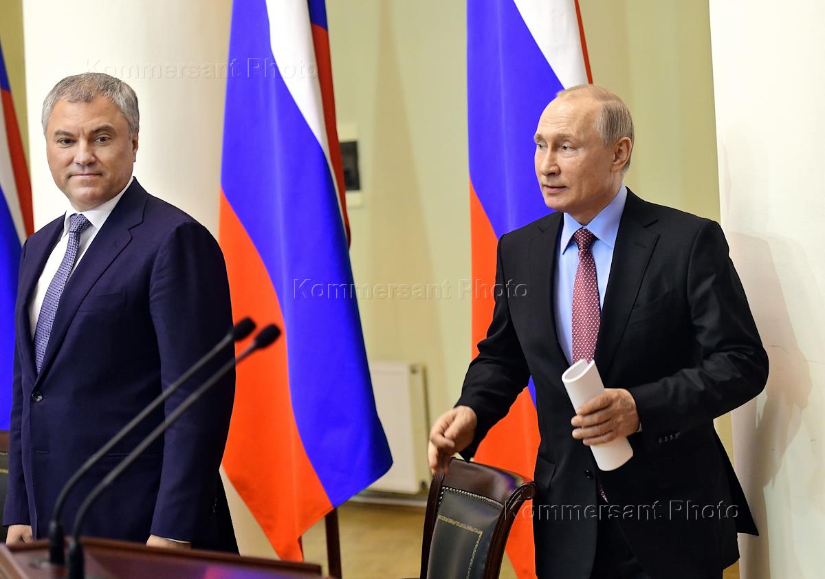 Рабочая поездка президента России Владимира Путина в Санкт-Петербург. Президент России Владимир Путин (справа) и председатель Государственной Думы России Вячеслав Володин (слева) во время встречи с членами Совета законодателей при Федеральном Собрании России. Встреча прошла в Таврическом дворце.