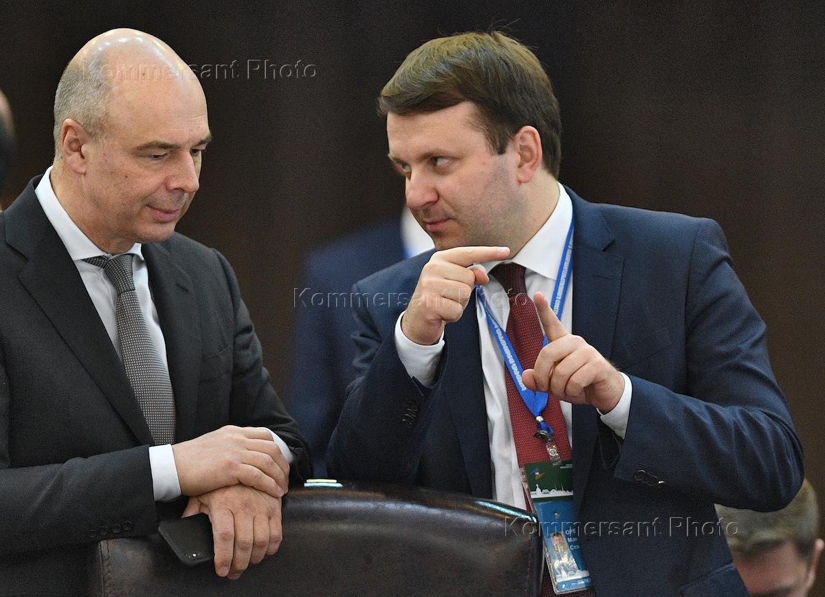 Рабочая поездка председателя правительства Дмитрия Медведева в Армению. Первый заместитель председателя Правительства России - министр финансов России Антон Силуанов (слева) и министр экономического развития России Максим Орешкин (справа) перед началом заседания Евразийского межправительственного совета в расширенном составе.