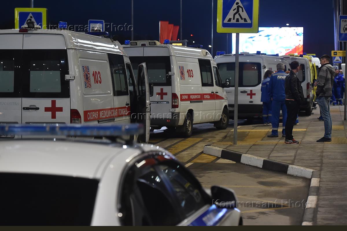 Последсвия пожара самолета Sukhoi Superjet-100 с бортовым номером RA-89098 авиакомпании "Аэрофлот", который следовал в Мурманск из Москвы и совершил вынужденную посадку в аэропорту Шереметьево. Машины "Скорой помощи" на территории аэропорта.