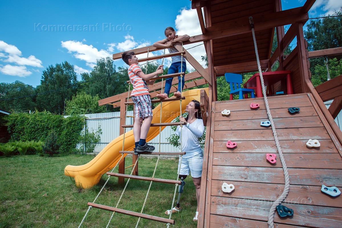 Одной левой или история Алены Волоховой. Алена Волохова с детьми на спортивной площадке у своего дома.