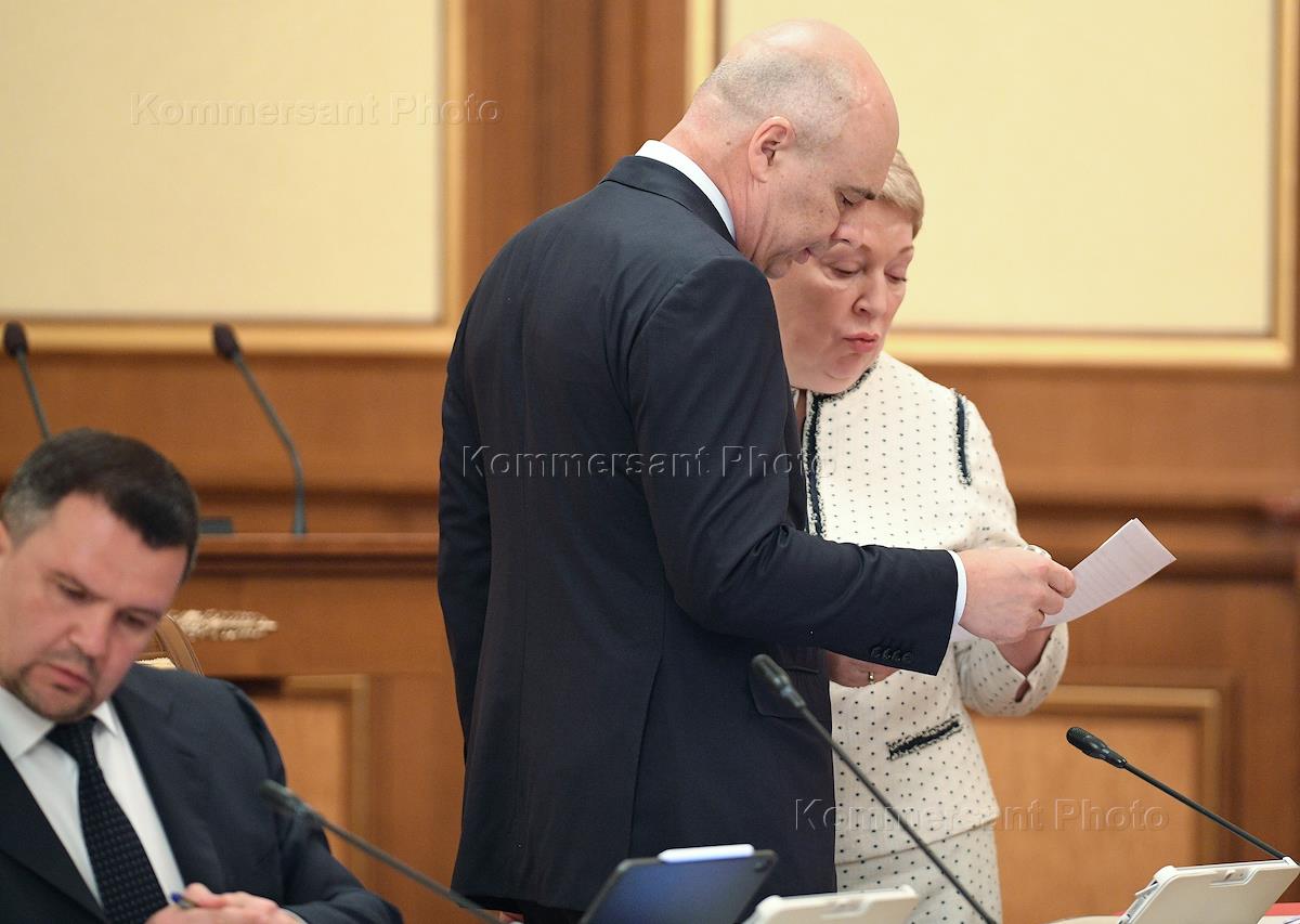 Заседание правительства России. Первый заместитель председателя правительства России - министр финансов России Антон Силуанов (второй справа) и заместитель председателя правительства России Ольга Голодец (справа) перед началом заседания.