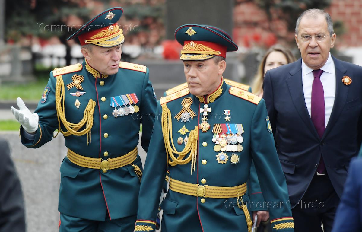 Военный парад, посвященный 74-й годовщине Победы в Великой Отечественной войне, на Красной площади. Начальник Генерального штаба Вооруженных cил России – первый заместитель министра обороны России Валерий Герасимов (в центре) и министр иностранных дел России Сергей Лавров (справа) перед началом парада.