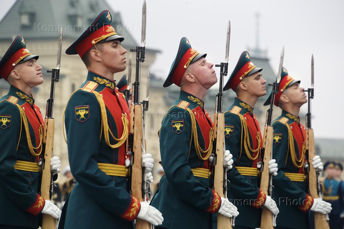 Военный парад, посвященный 74-й годовщине Победы в Великой Отечественной войне, прошел на Красной площади. Знаменные группы с государственным флагом России, Знаменем Победы и знаменем вооруженных сил России 154-го отдельного комендантского Преображенского полка во время парада.