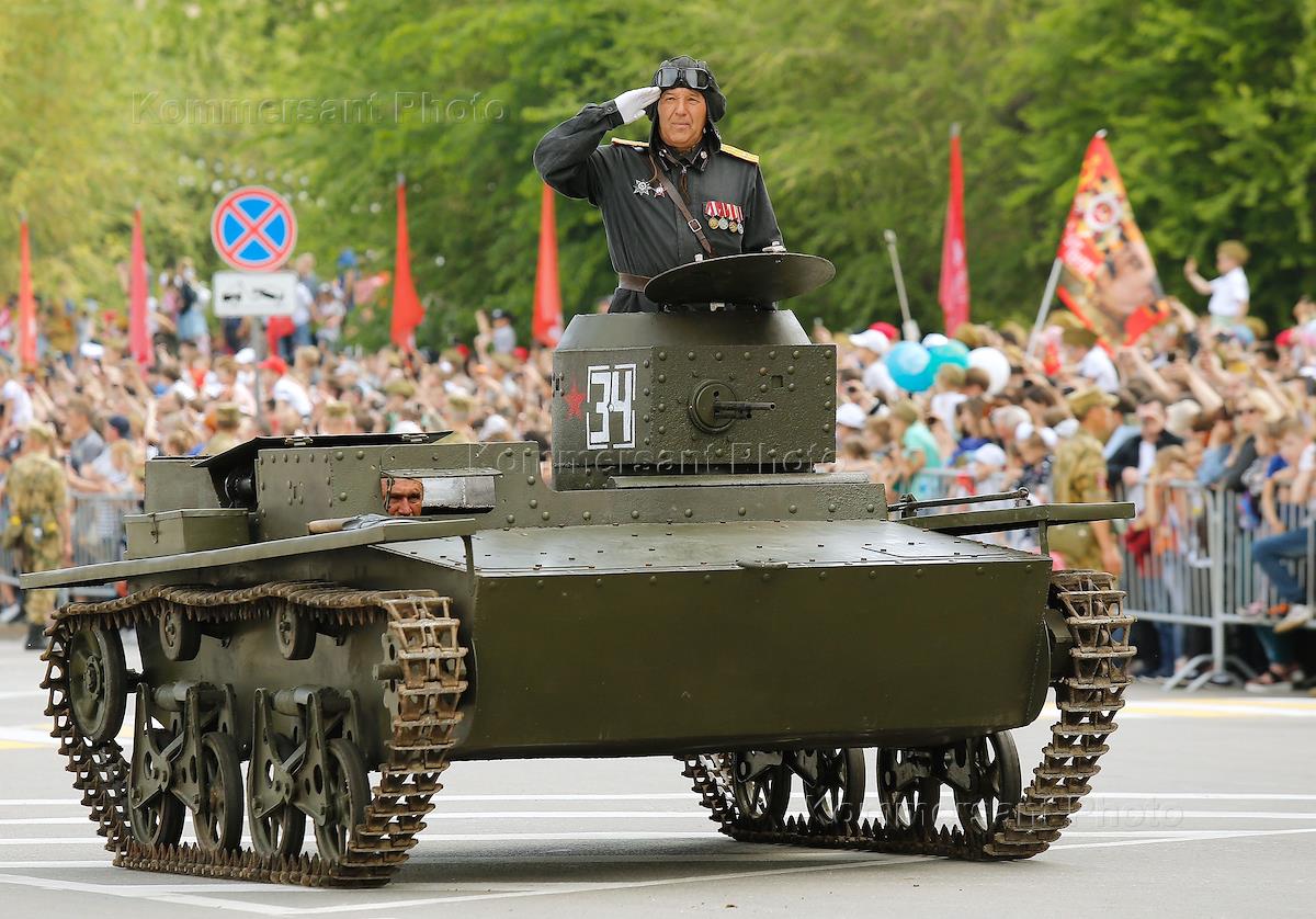 Празднование Дня Победы. Военный парад, посвященный 74-й годовщине Победы в Великой Отечественной войне, прошел на площади Павших Борцов. Сержант в отставке Александр Иванов на плавающем танке Т-38 времен советско-финской и Великой Отечественной войн, над восстановлением которого он работал.