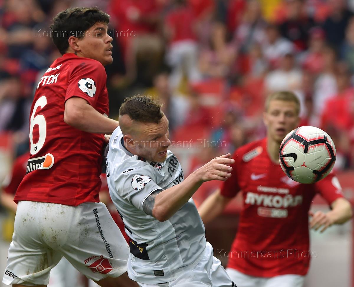 Russian Premier League (RPL). Russian Football Championship 2018/2019. 28th round. The match between Spartak (Moscow) and Ufa (Ufa) at the Otkritie Arena stadium. Fernando Lucas of Spartak (left) and Catalin Carp of Ufa (right) during the match.