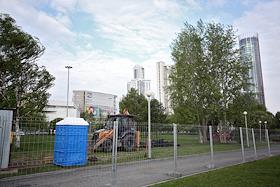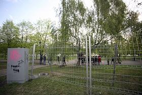 Забор вокруг стройки храма в сквере у театра Драмы.