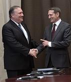 Рабочая поездка президента России Владимира Путина в Сочи. Государственный секретарь США Майк Помпео (слева) и директор Службы внешней разведки России Сергей Нарышкин (справа) перед началом встречи с президентом России Владимиром Путиным в резиденции "Бочаров ручей".