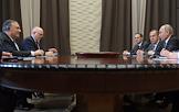 Рабочая поездка президента России Владимира Путина в Сочи. Государственный секретарь США Майк Помпео (слева) и справа налево: президент России Владимир Путин, министр иностранных дел России Сергей Лавров и директор Службы внешней разведки России Сергей Нарышкин во время встречи в резиденции "Бочаров ручей".