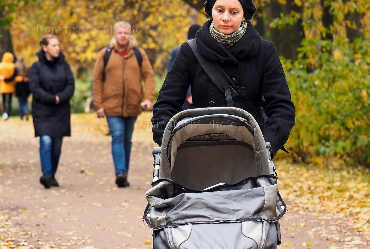 Жанровая фотография. Женщина с коляской гуляет в парке.